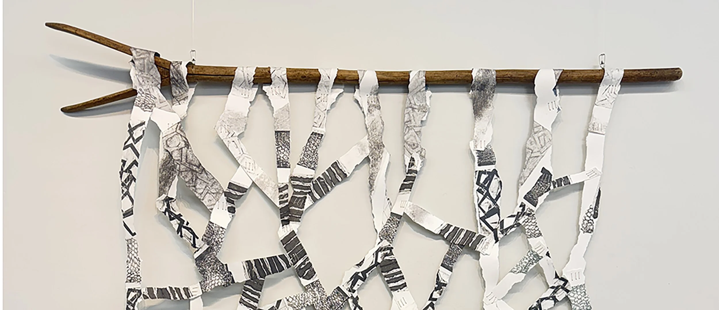 Nothing is lost (found object and netting) 2024 and Dancing in the Air (series of paper lithographs on handmade paper, 2025