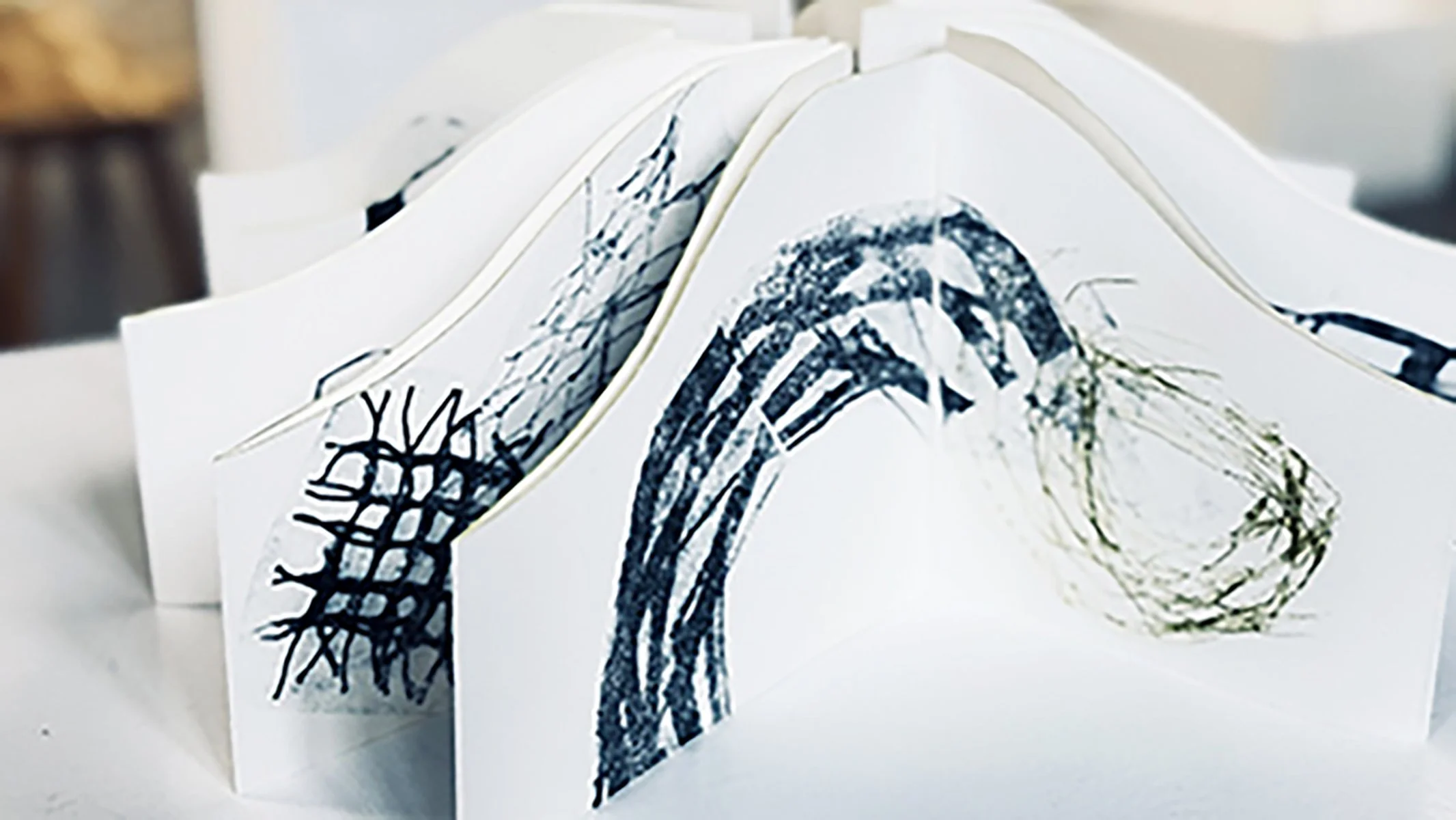 Nexus, artist book illustrated with paper lithography images of weavings, string and fibres.