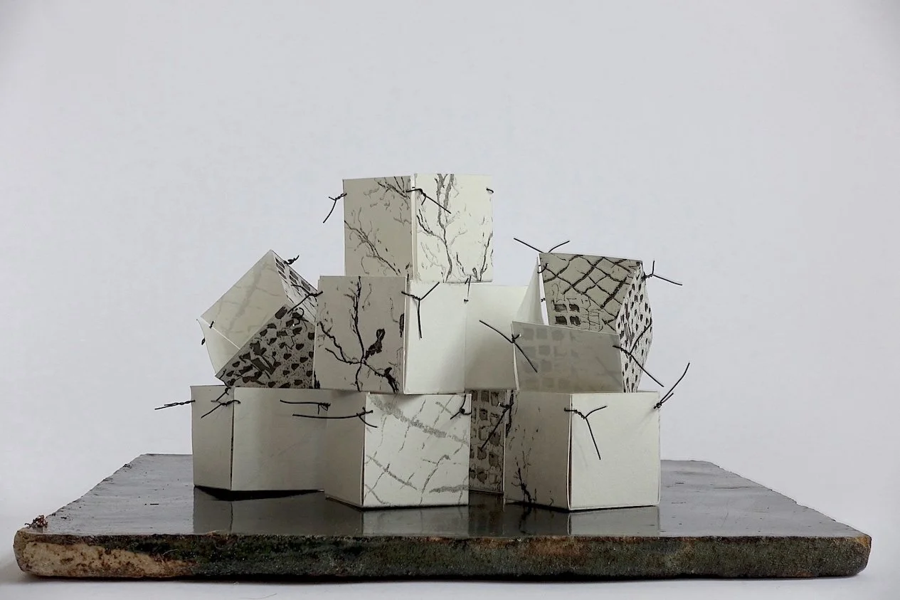 Copper plate etchings on Somerset paper, each cube 5 x 5 cms, with wire fastenings