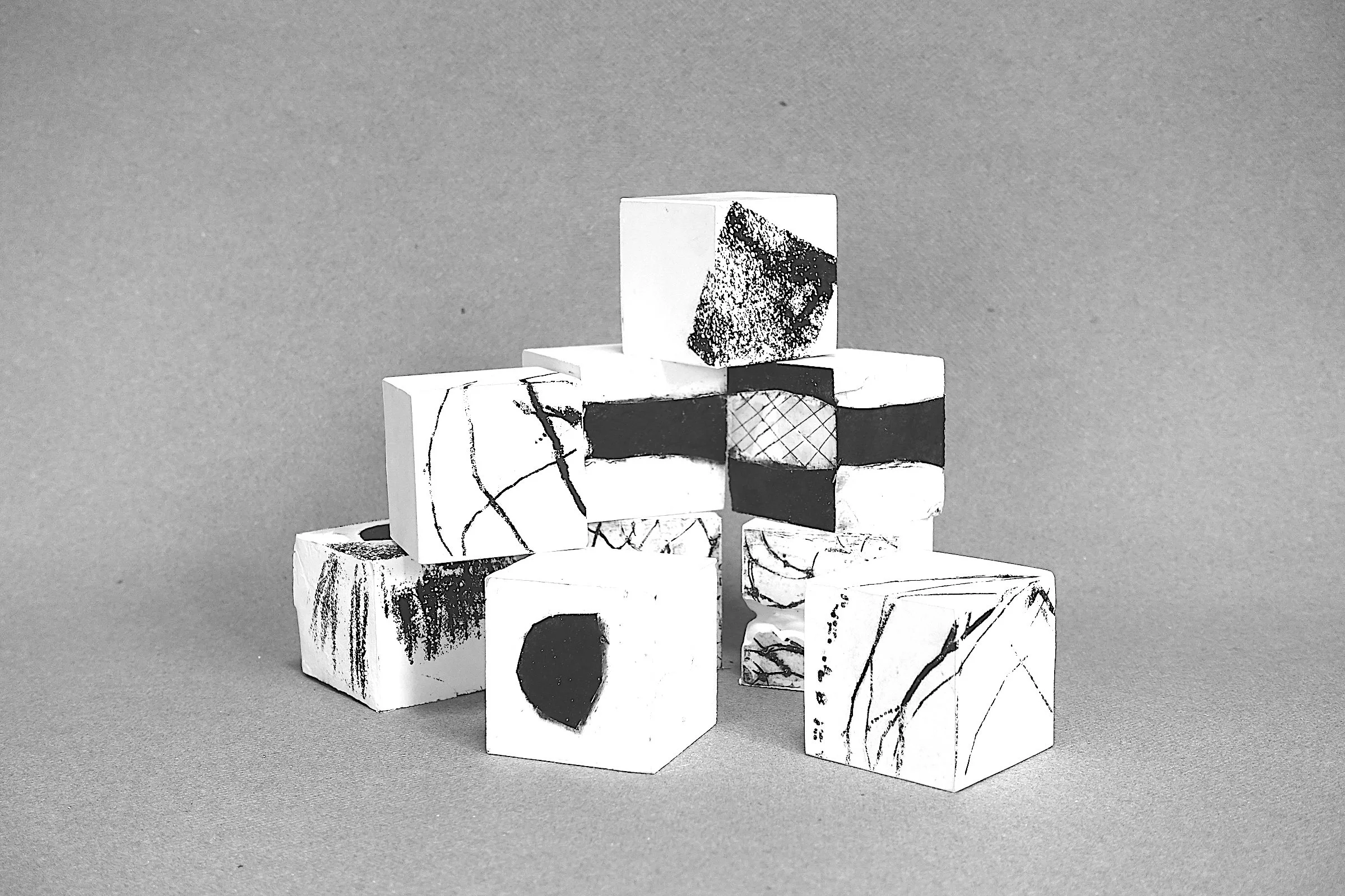 Plaster blocks (each 5 x 5 cms) with drypoint and paper lithography print